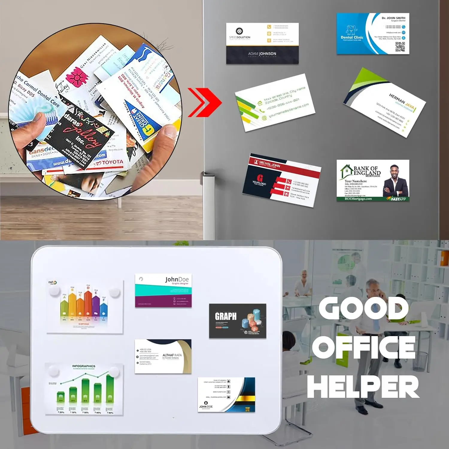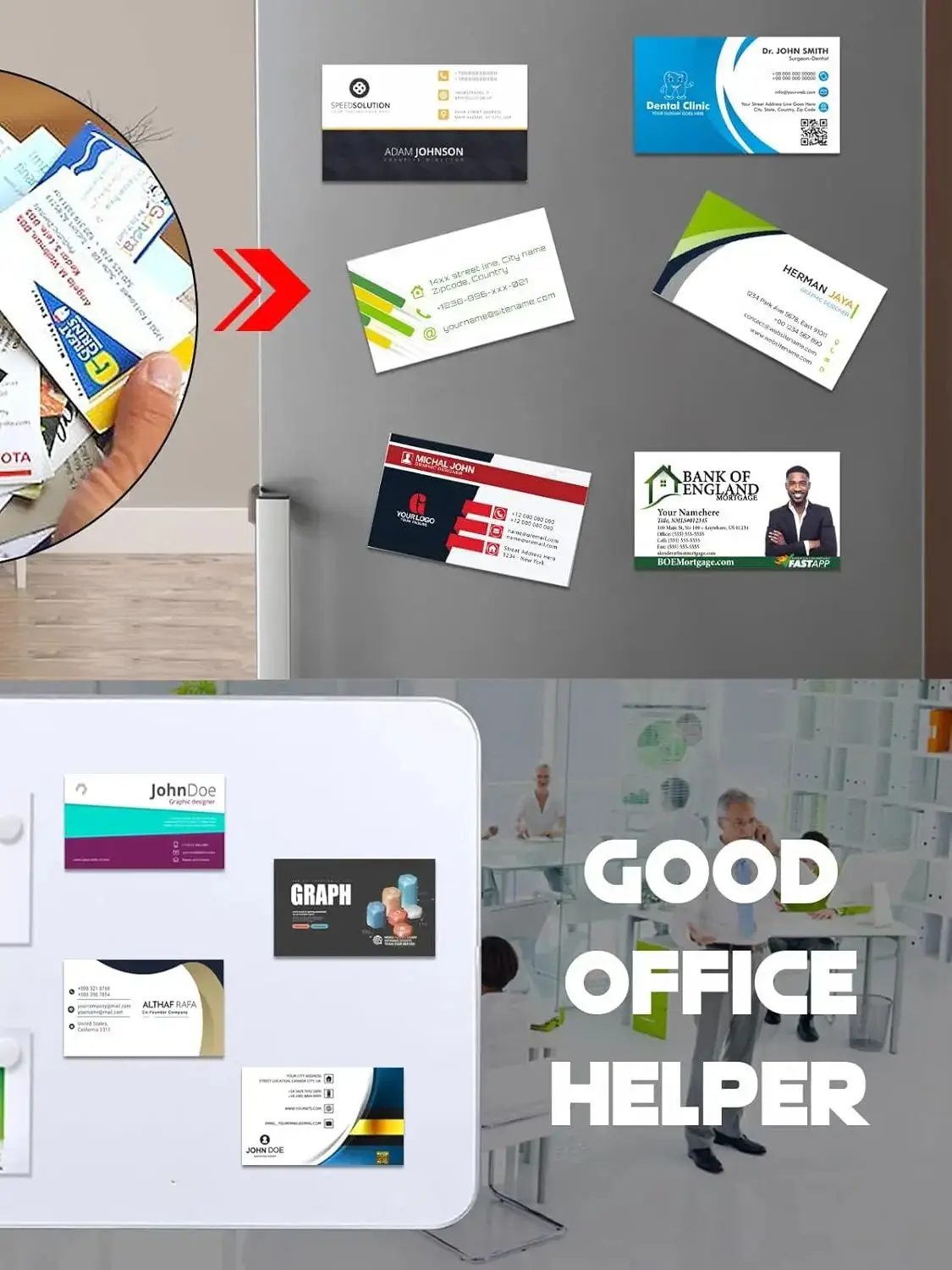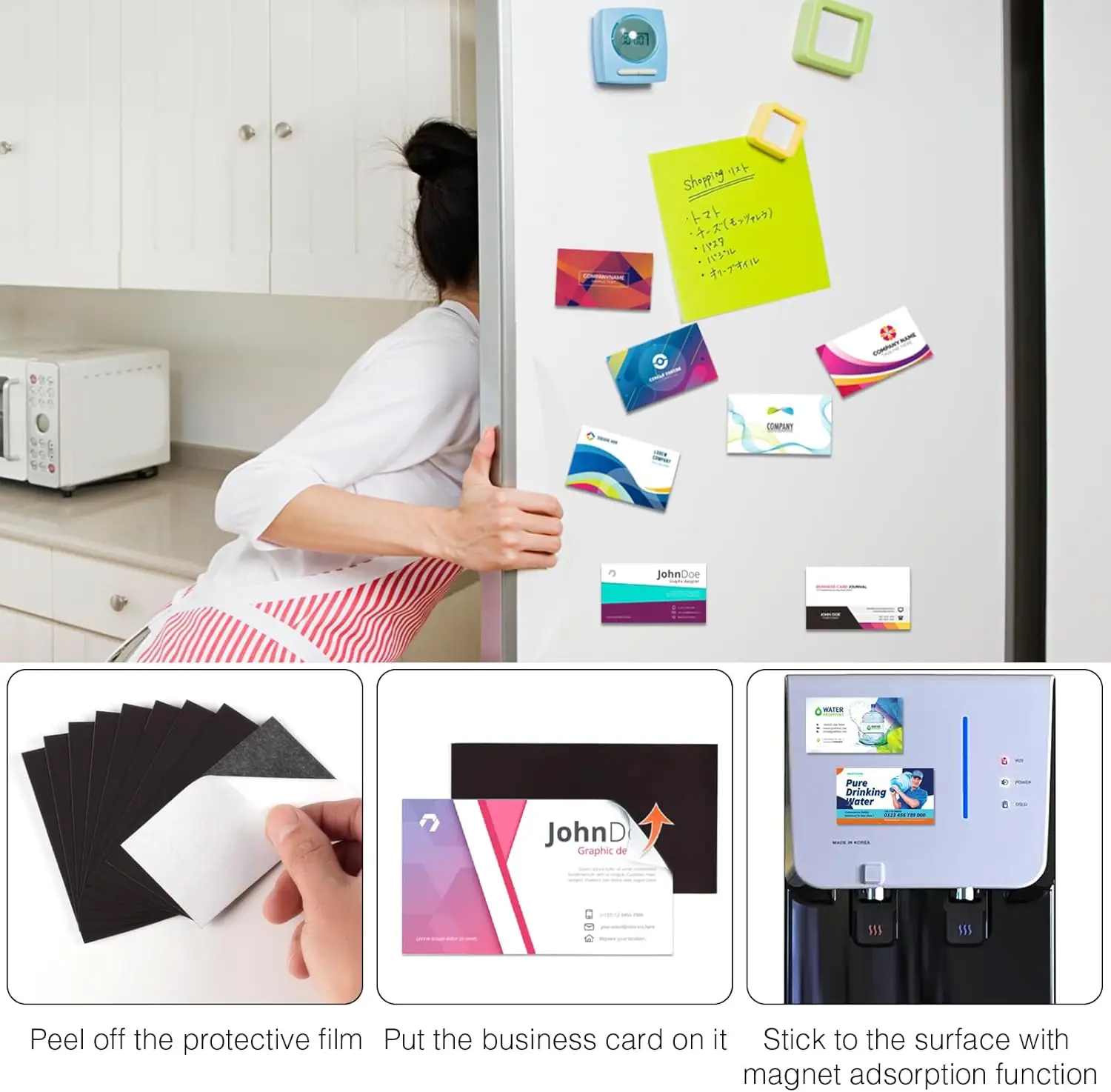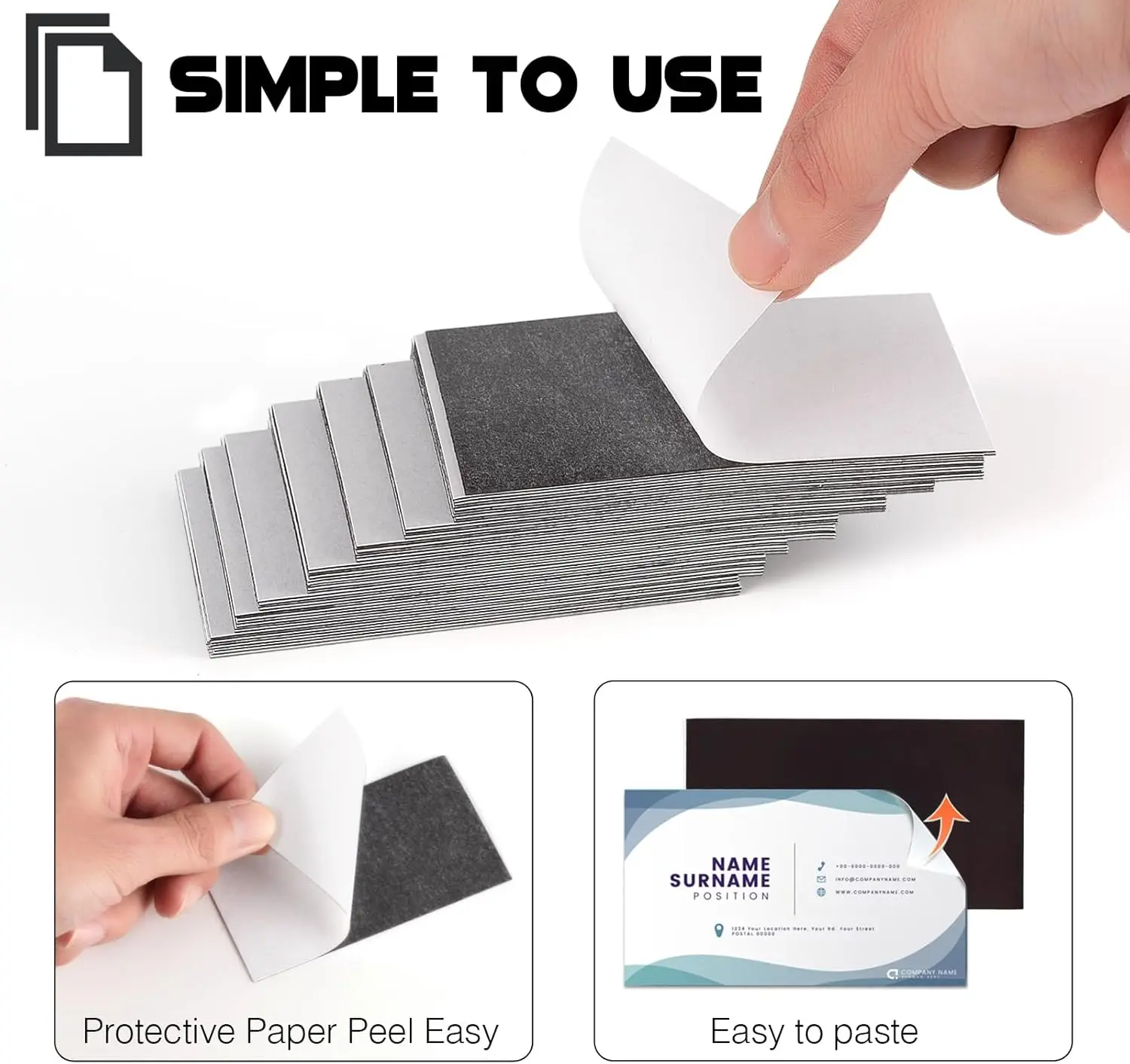 La cinta autoadhesiva permite una fácil aplicación, convirtiendo las tarjetas de presentación comunes en imanes sin esfuerzo.
