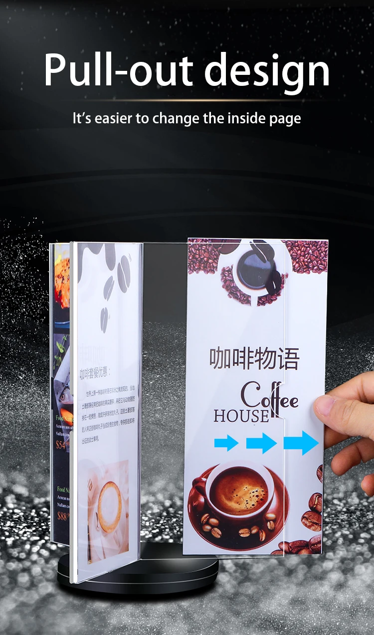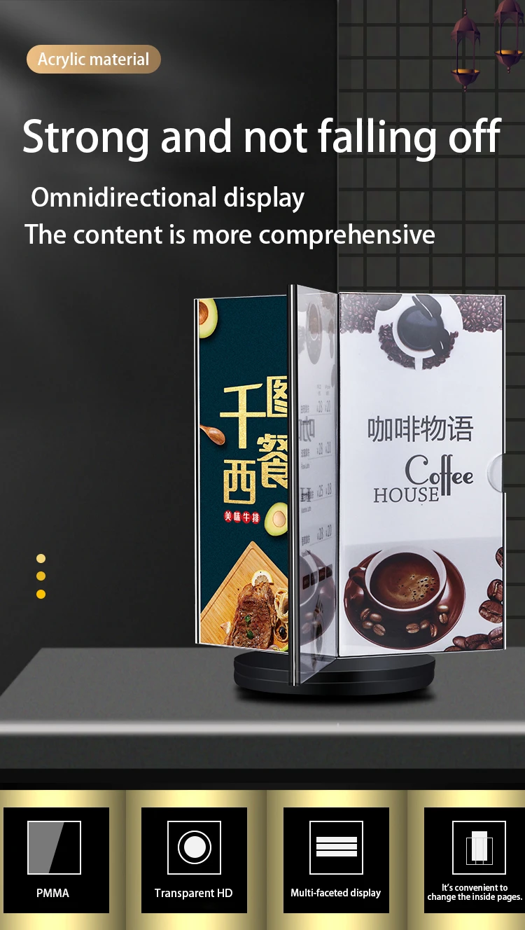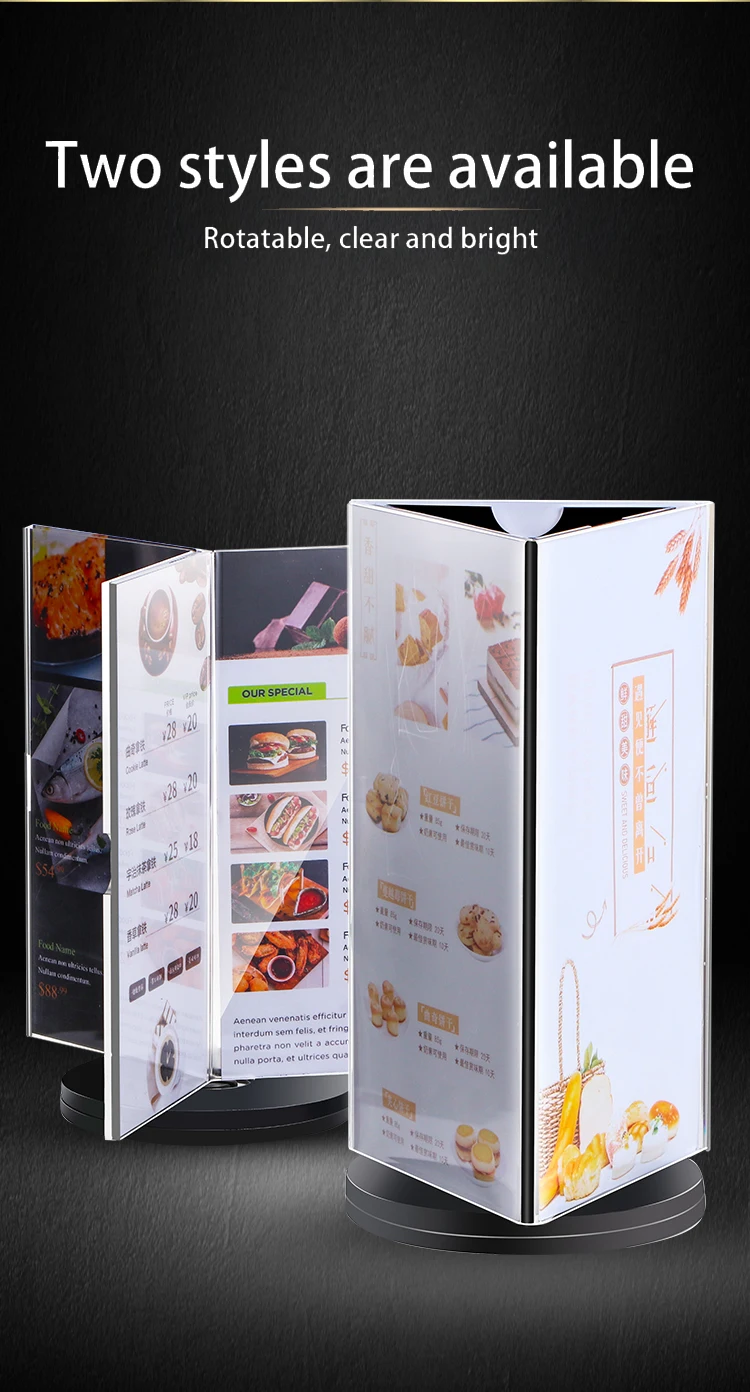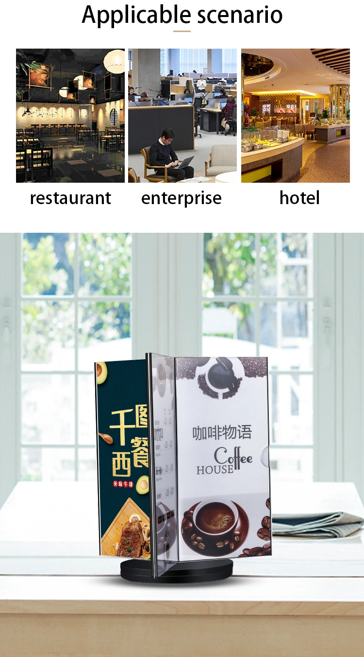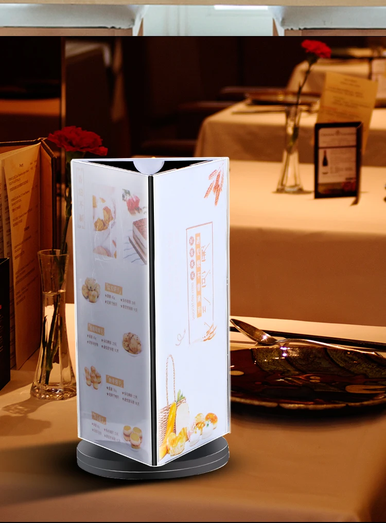 Tarjeta de menú acrílica de alta gama, tarjeta de bebidas, estante de exhibición giratorio de fondo redondo 360, tarjeta de etiqueta de Hotel para comedor, diseño creativo