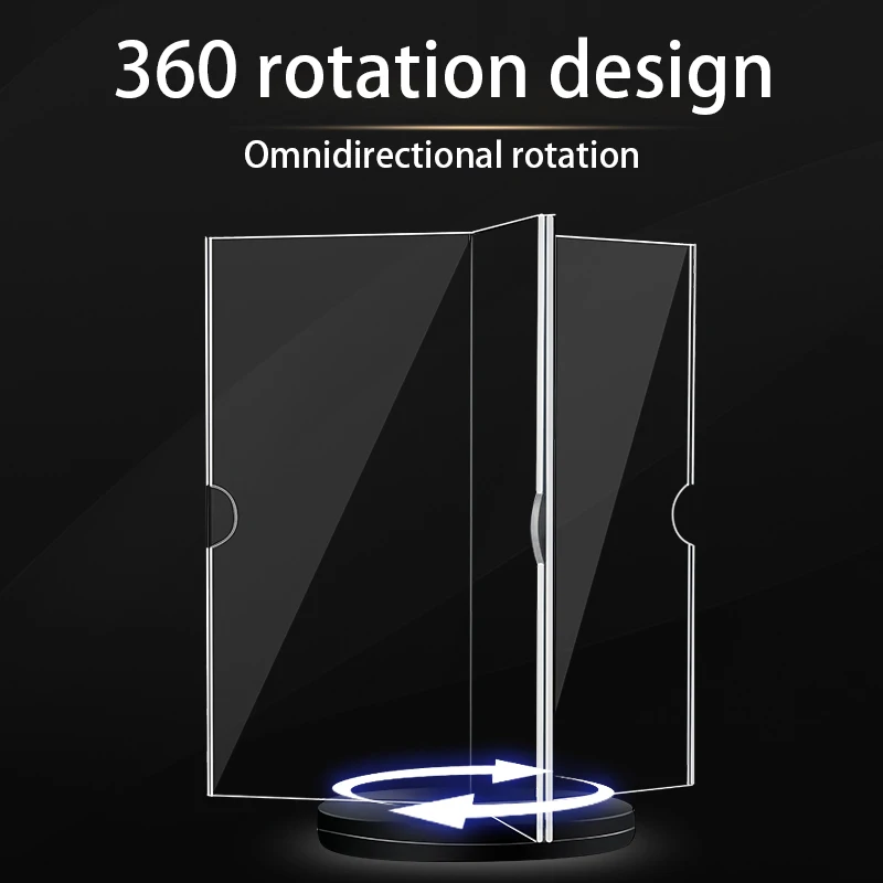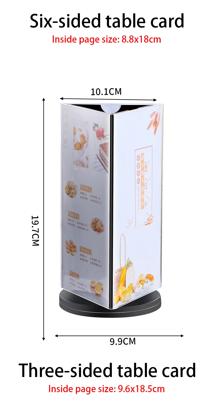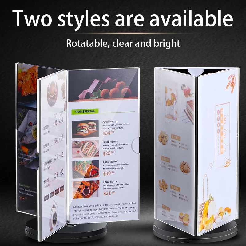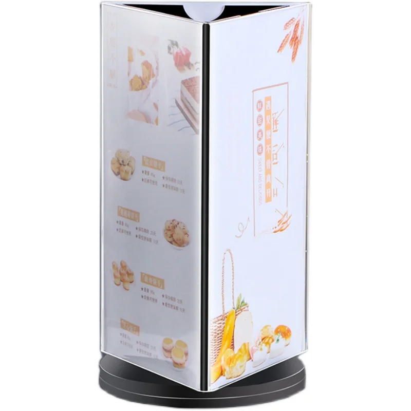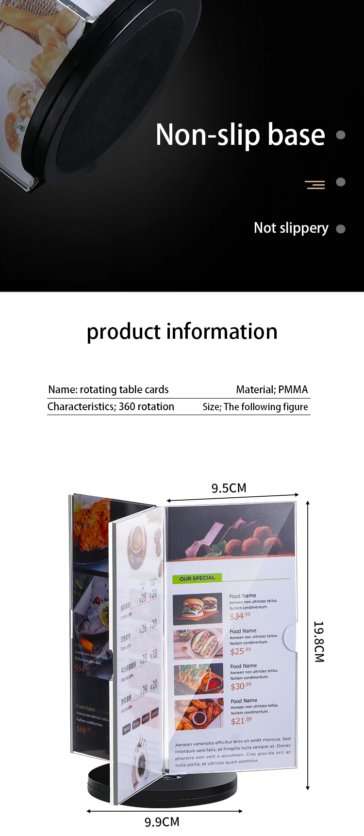 Tarjeta de menú acrílica de alta gama, tarjeta de bebidas, estante de exhibición giratorio de fondo redondo 360, tarjeta de etiqueta de Hotel para comedor, diseño creativo