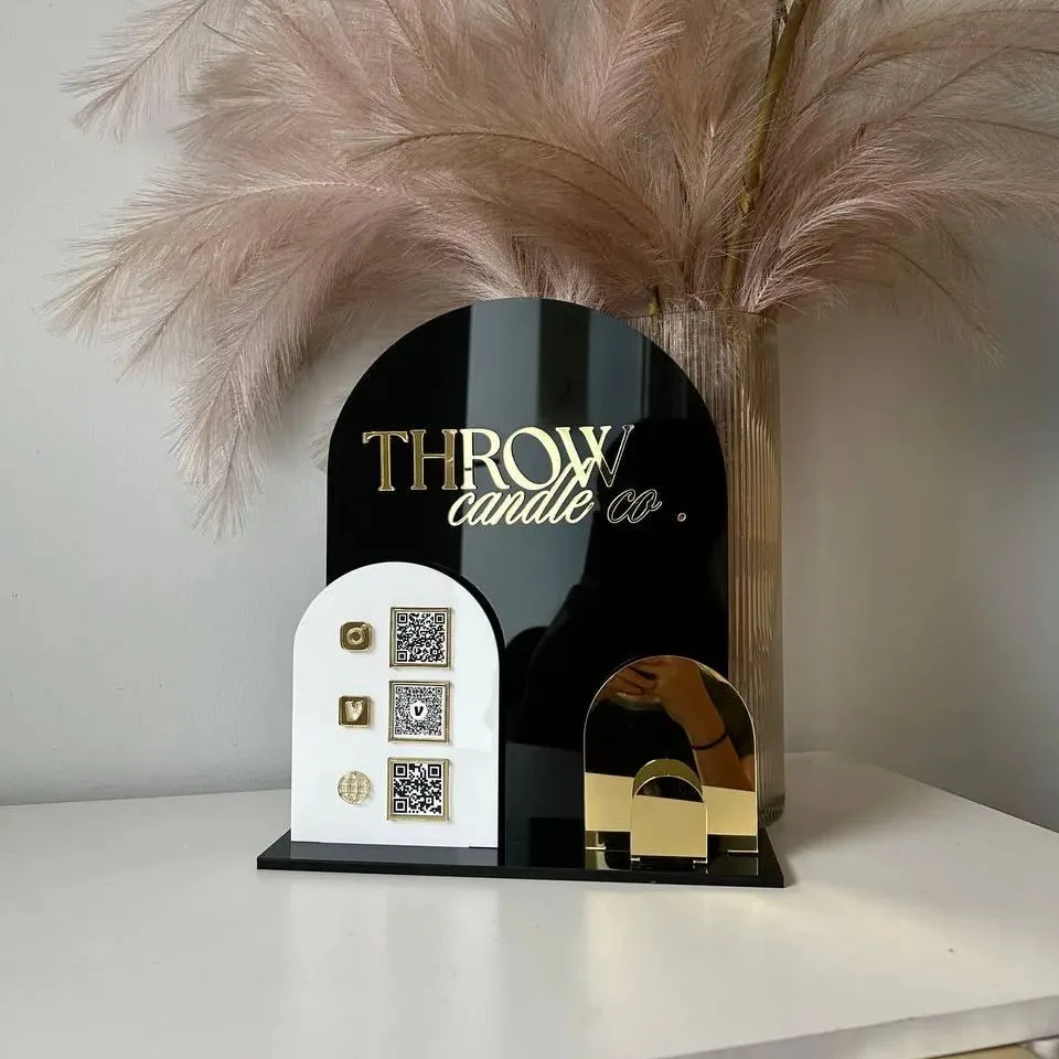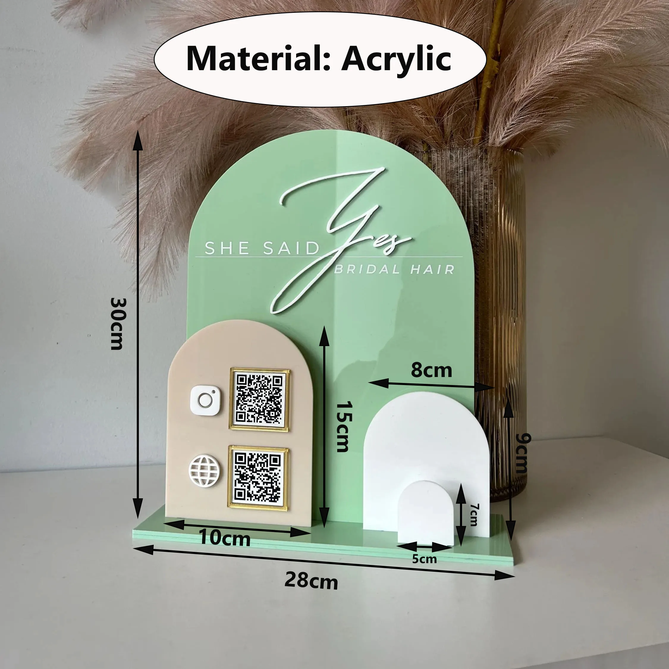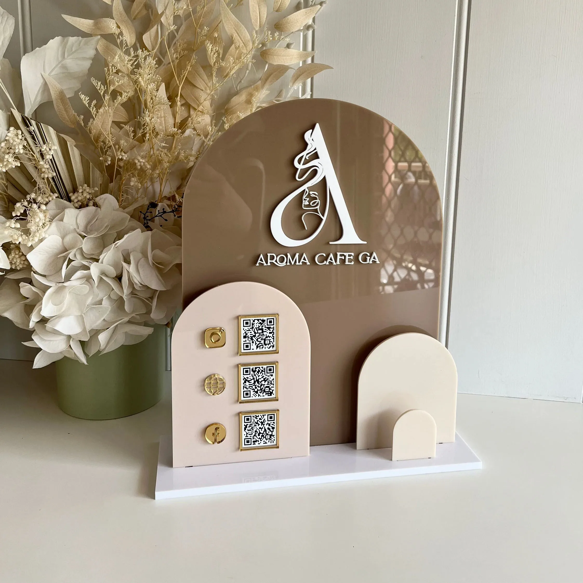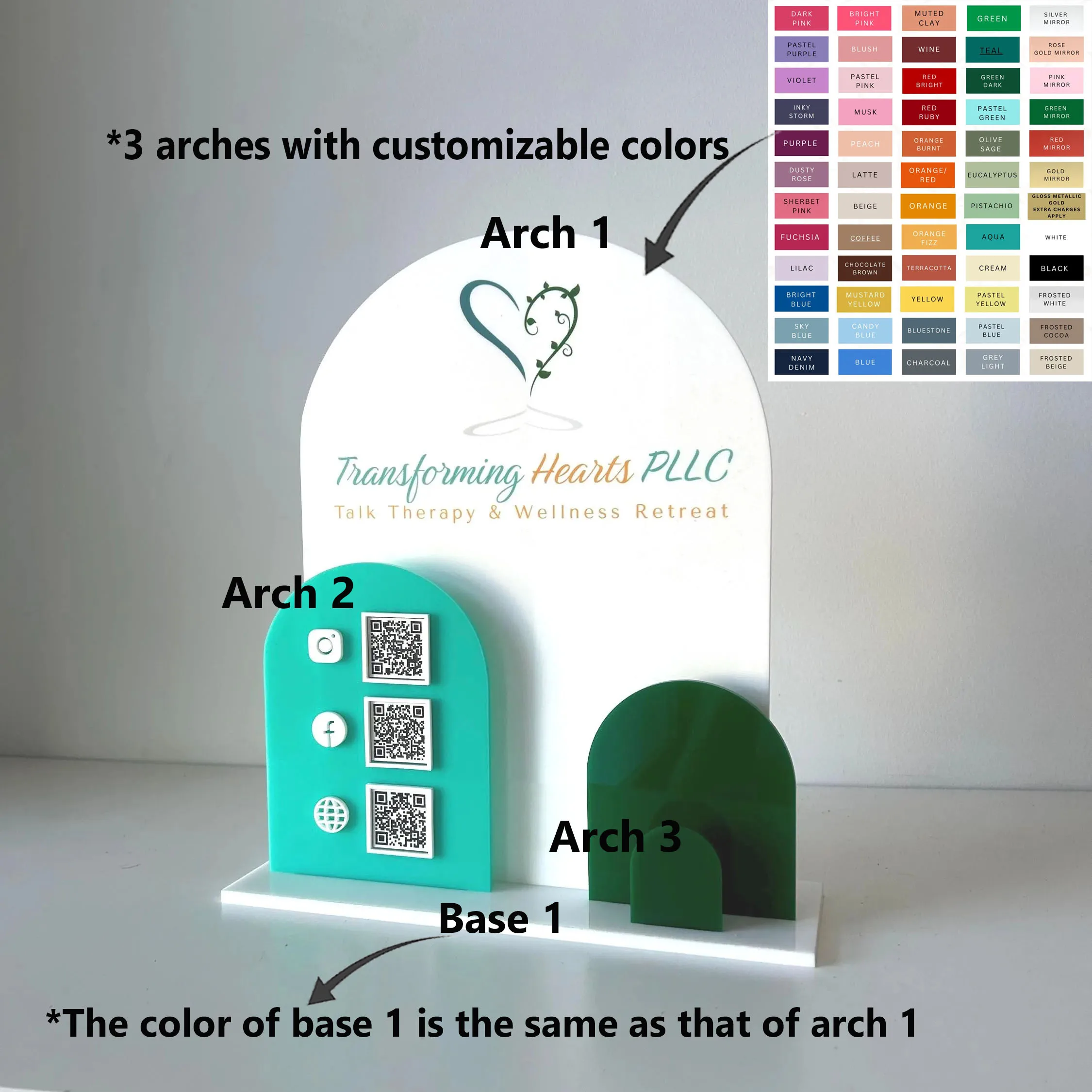 Soporte de exhibición de código QR de escritorio acrílico arqueado multicolor personalizable con ranura para tarjetas de visita para negocios de pago de redes sociales