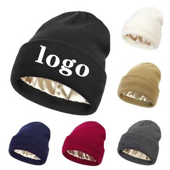 Gorro con forro de satén de seda tejido con logotipo personalizado, gorro acrílico con forro de satén de alta calidad para invierno, venta al por mayor, suave, Unisex