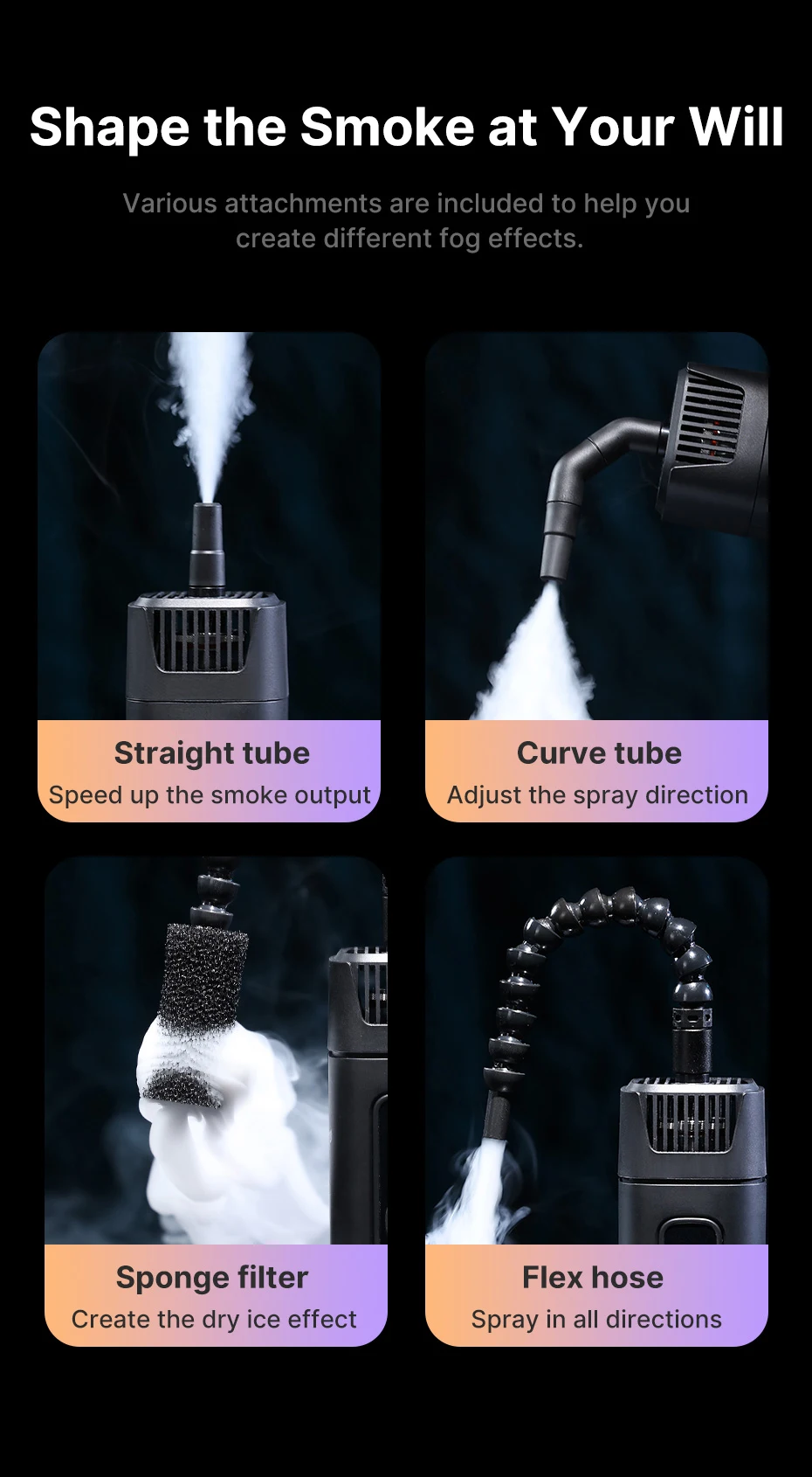 3. Dale forma al humo a tu voluntad: se incluyen varios accesorios para ayudarte a crear diferentes efectos de niebla.